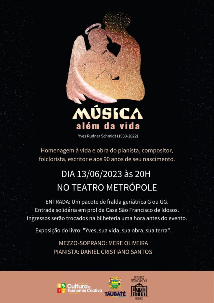 Para celebrar os 90 anos de nascimento de Yves Rudner Schmidt, o Teatro Metrópole recebe o espetáculo “Música além da vida”, no dia 13 de junho, terça-feira, às 20h.